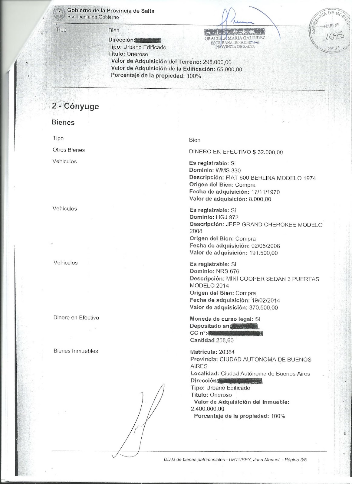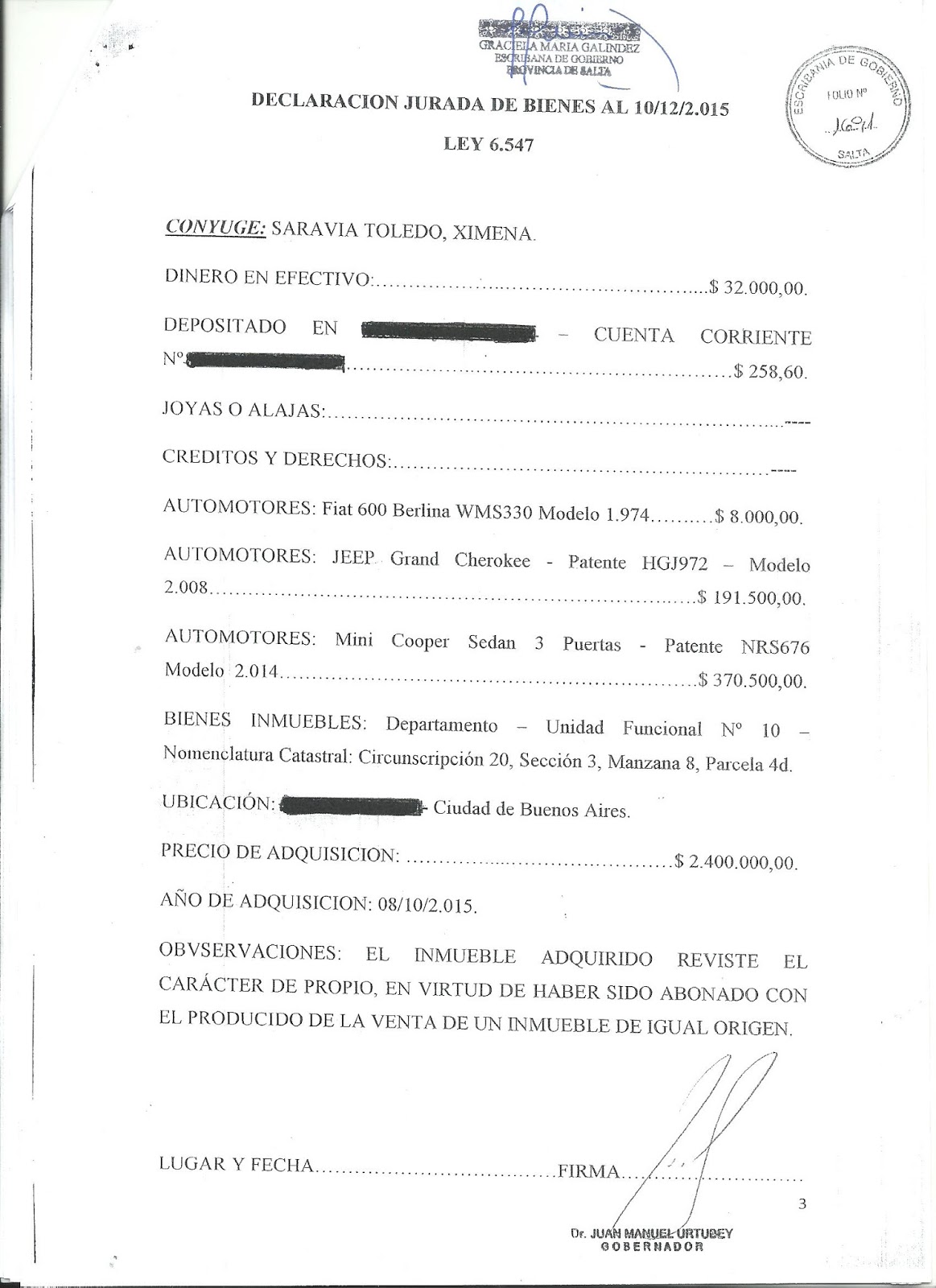 Publicamos a continuación un detalle del contenido de las 4 últimas DDJJ presentadas por el Gobernador Urtubey ante la Escribanía de Gobierno.
