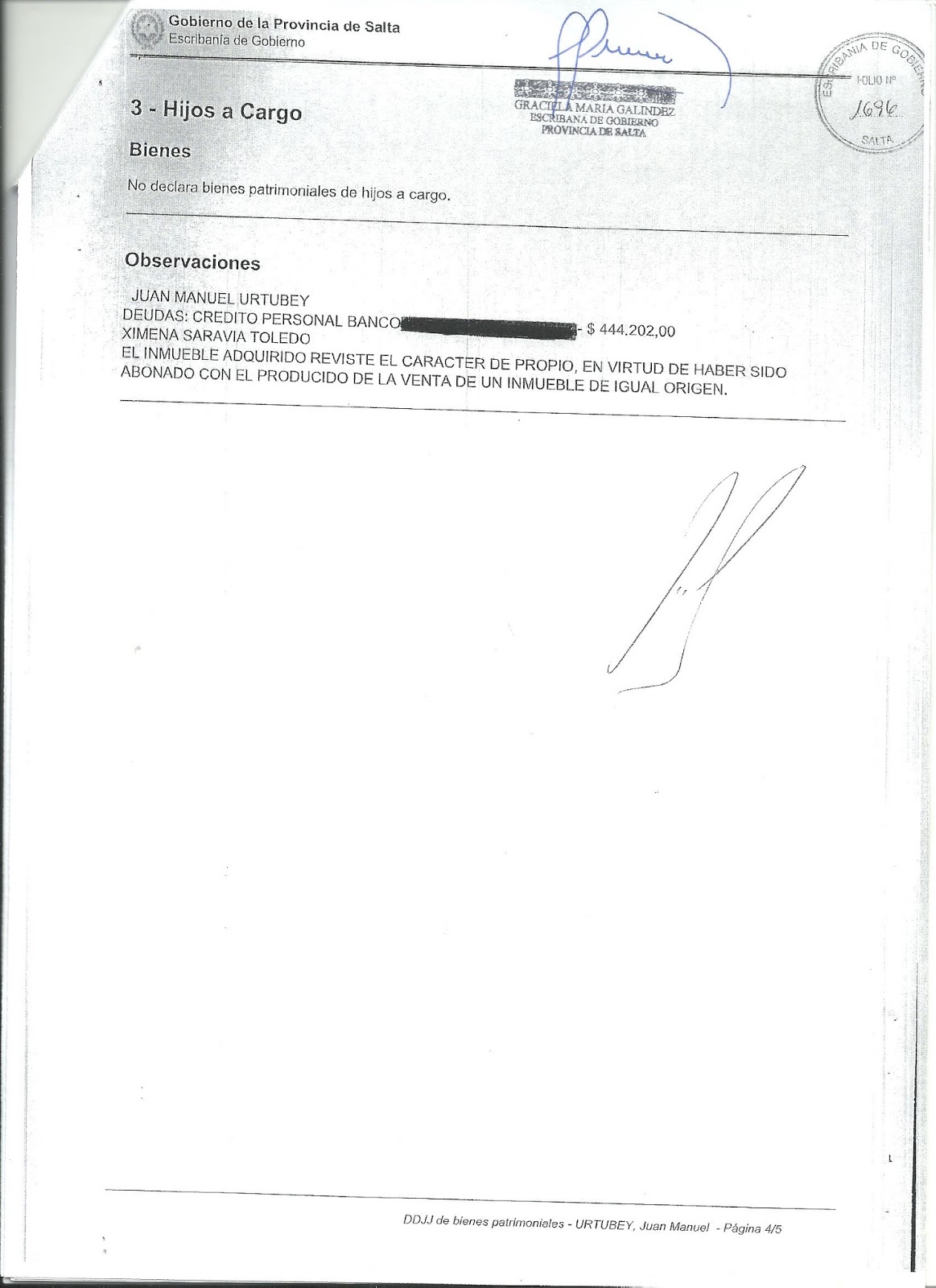 Mantiene también una deuda de $ 444.202 con una entidad bancaria cuyo nombre fue testado por la Escribanía de Gobierno.