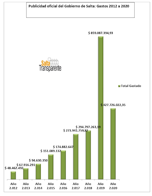 Es posible proyectar que entre agosto y diciembre de 2020 el gasto publicitario de la Provincia sea de $ 187.795.693,35 más, (si se repite en esos meses el gasto del mes de julio que fue de $ 37.559.138,67), lo que permitiría afirmar que en definitiva durante el 2020, el gasto publicitario sea de $ 427.726.022,35, una cifra excesiva y que en los hechos implica una continuidad con el nivel de gasto publicitario de Urtubey, a excepción claro está del 2019, año de la campaña presidencial del ex Gobernador, en el que el gasto publicitario se intensificó notablemente ya que se reforzaron partidas presupuestarias para aumentar ese año la pauta de medios locales y para distribuir pauta entre medios nacionales y consultoras de marketing de Buenos Aires.